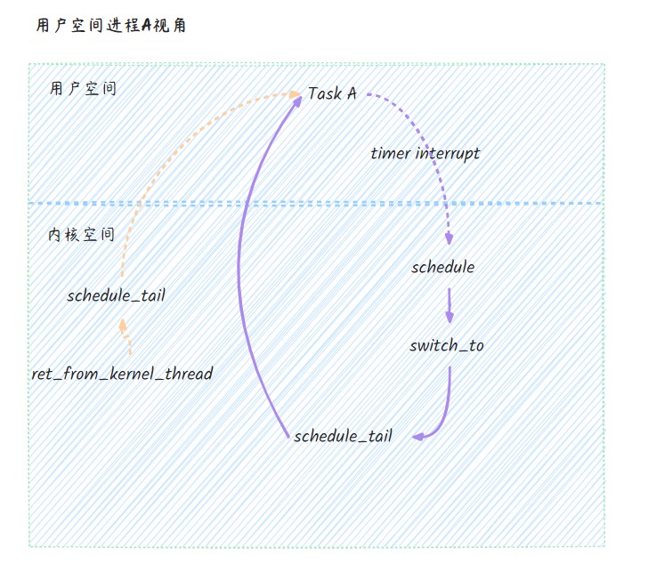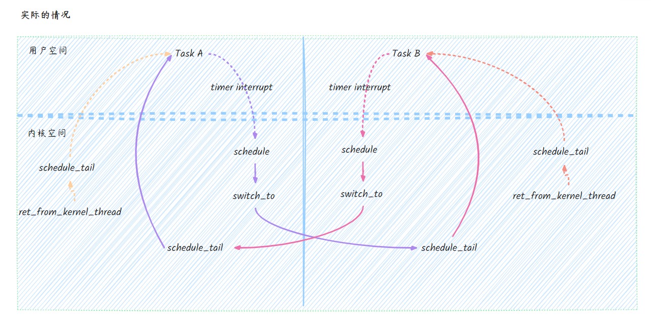 generic_handle_arch_irq()(kernel/irq/handle.c) riscv_intc_irq()(drivers/irqchip/irq-riscv-intc.c) generic_handle_domain_irq()(kernel/irq/irqdesc.c) handle_irq_desc()(kernel/irq/irqdesc.c) generic_handle_irq_desc(include/linux/irqdesc.h) riscv_timer_interrupt()(drivers/clocksource/timer-riscv.c) clockevents_program_event()(kernel/time/clockevents.c) /* * Setup the next period for devices, which do not have * periodic mode: * 其中TICK_NSEC=((NSEC_PER_SEC+HZ/2)/HZ) */ next = ktime_add_ns(next, TICK_NSEC); //设置下一次tick的时间 riscv_clock_next_event()(drivers/clocksource/timer-riscv.c) evdev->event_handler(evdev); tick_handle_periodic()(kernel/time/tick-common.c) tick_periodic()()(kernel/time/tick-common.c) update_process_times()(kernel/time/timer.c) scheduler_tick()(kernel/sched/core.c) //调度器的tick函数 curr->sched_class->task_tick(rq, curr, 0); //这里调用CFS的task_tick task_tick_fair()(kernel/sched/fair.c) /* * Update run-time statistics of the 'current'. */ update_curr(cfs_rq); if (cfs_rq->nr_running > 1) check_preempt_tick(cfs_rq, curr); ideal_runtime = sched_slice(cfs_rq, curr); delta_exec = curr->sum_exec_runtime - curr->prev_sum_exec_runtime; // 时间片用完,设置TIF_NEED_RESCHED标识 if (delta_exec > ideal_runtime) { resched_curr(rq_of(cfs_rq)); set_tsk_need_resched() (kernel/sched/core.c) set_tsk_thread_flag(tsk,TIF_NEED_RESCHED); /* * The current task ran long enough, ensure it doesn't get * re-elected due to buddy favours. */ clear_buddies(cfs_rq, curr); return; }